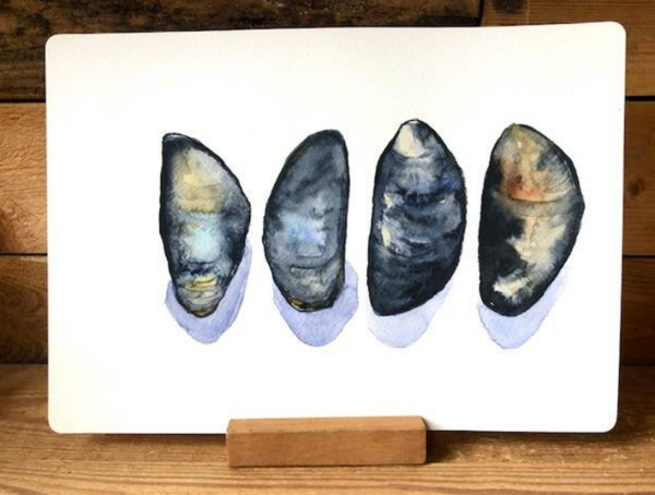 Ik ben er gek op, mosselen! Jij ook? Deze handgemaakte aquarel is op A4 formaat en prachtig om in te lijsten. (lijst niet meegeleverd). Het is een uniek en origineel aquarel. Geef je huis meer karakter.
